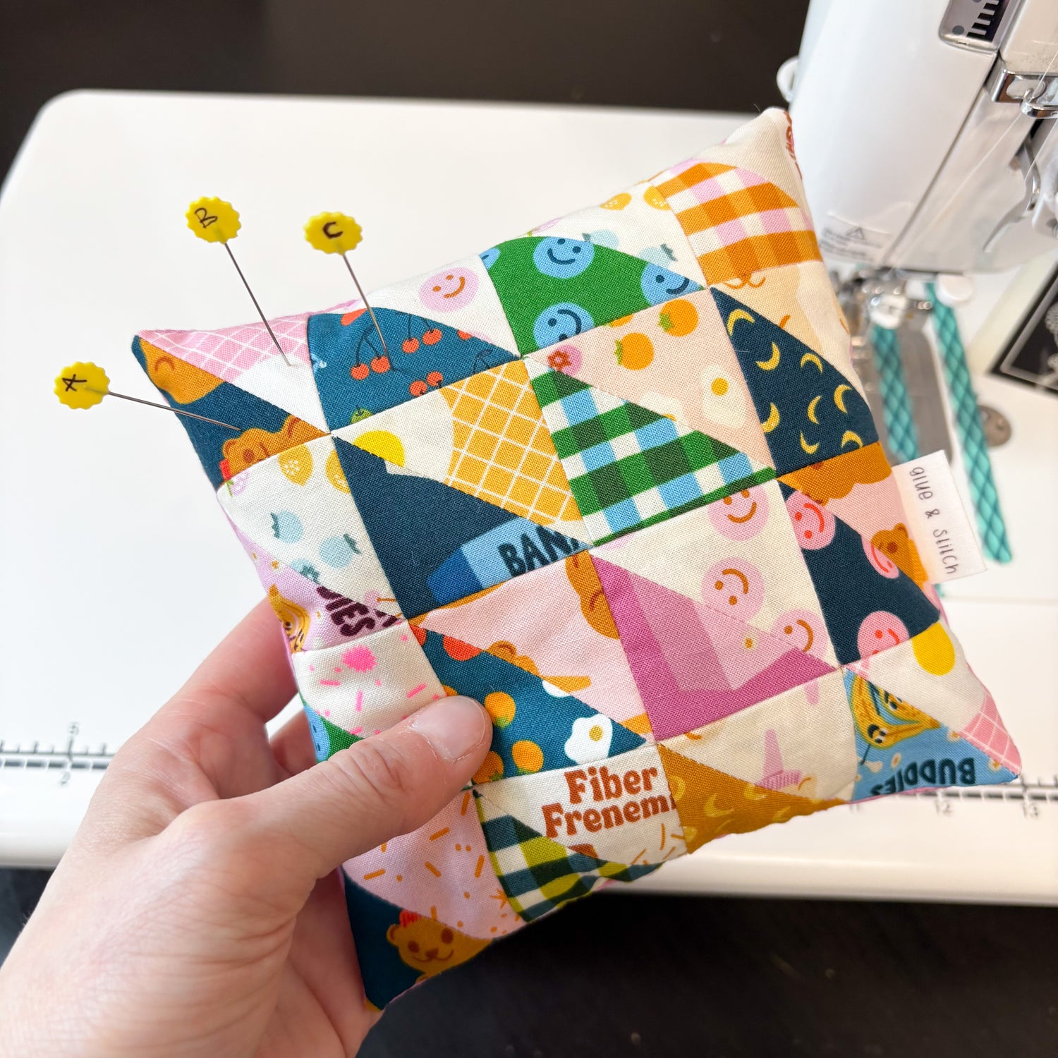 Make a quick, scrappy half square triangle pin cushion to keep your labeled pins organized and close at hand.