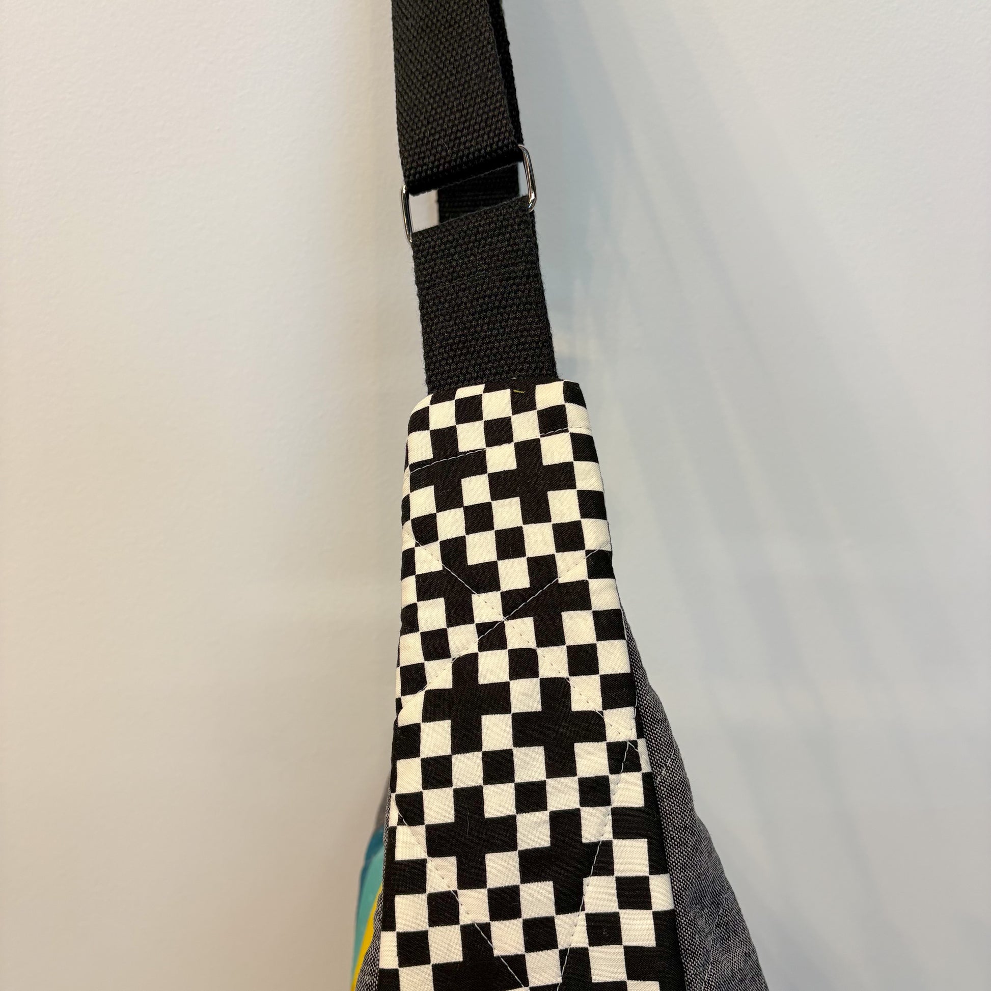 This one-of-a-kind version features a soft rainbow quilt pieced striped block that I was inspired to create from a stack of fabrics in my studio. Other thoughtful details throughout include a strawberry zipper charm by K.P. Creates for a little extra personality. Also, a divided mesh pocket on the inside for extra organization.