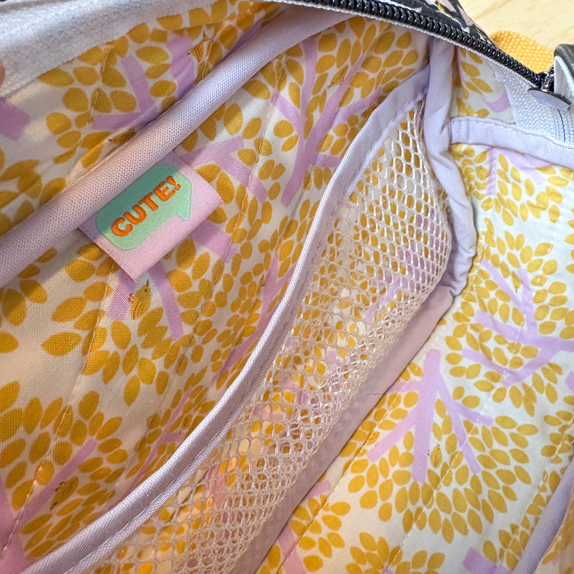 The Emerson Crossbody turns everyday carrying into a little adventure. Made from soft black Ruby Star Society quilting cotton sprinkled with pink flowers and fluttering butterflies, it’s cheerful and eye-catching. The adjustable mustard strap lets you wear it waist, front, or back, while a double-zip main compartment, front zipper pocket, and inside mesh slip pocket keep your essentials organized. The soft yellow Bird is the Word lining adds a sunny surprise inside every time you open it.