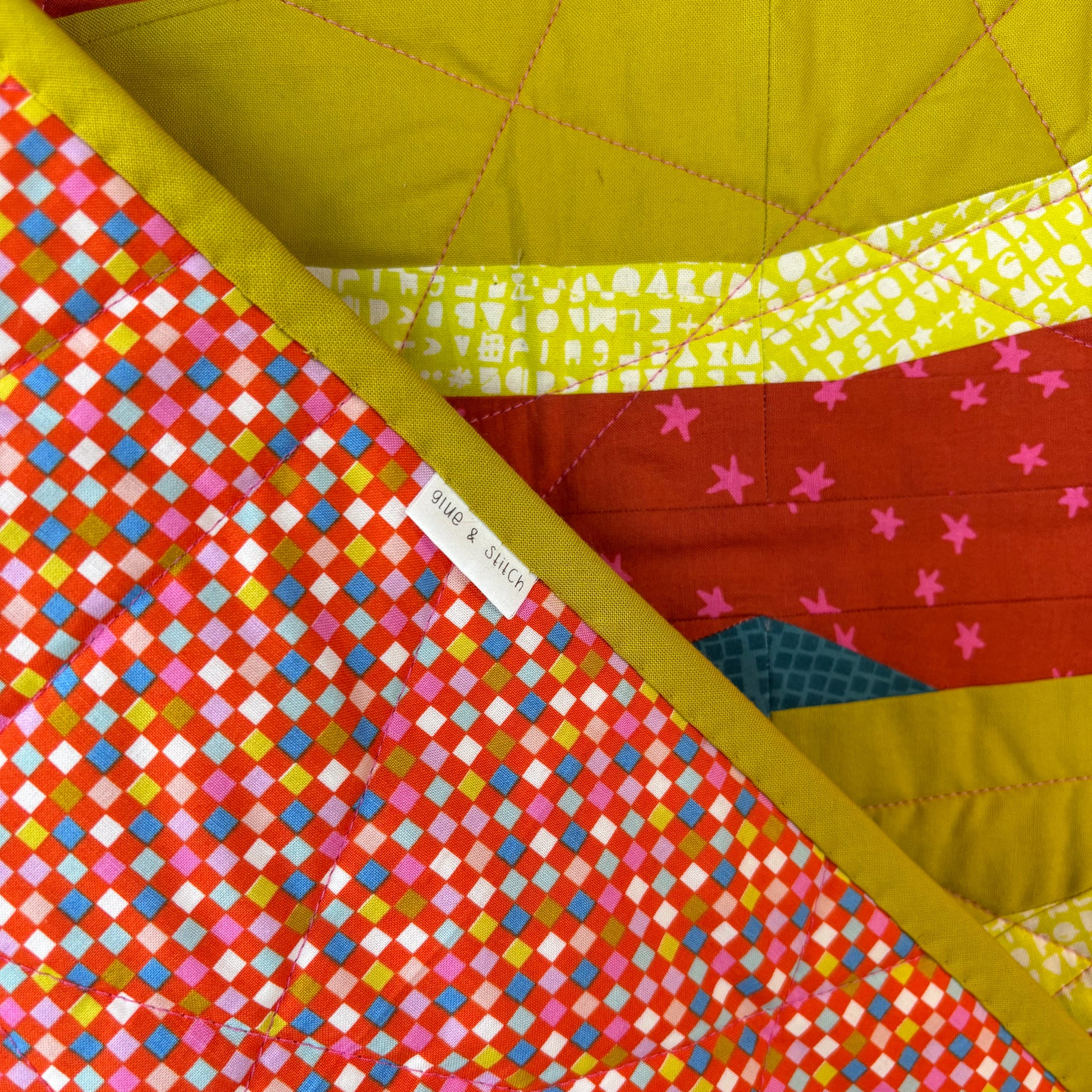 Constructed using foundation paper piecing for crisp shapes and clean lines, this piece is fully quilted with improv quilting lines. It is finished with a small woven tag featuring a seagull on the lookout for snacks, a tiny detail that adds extra personality.