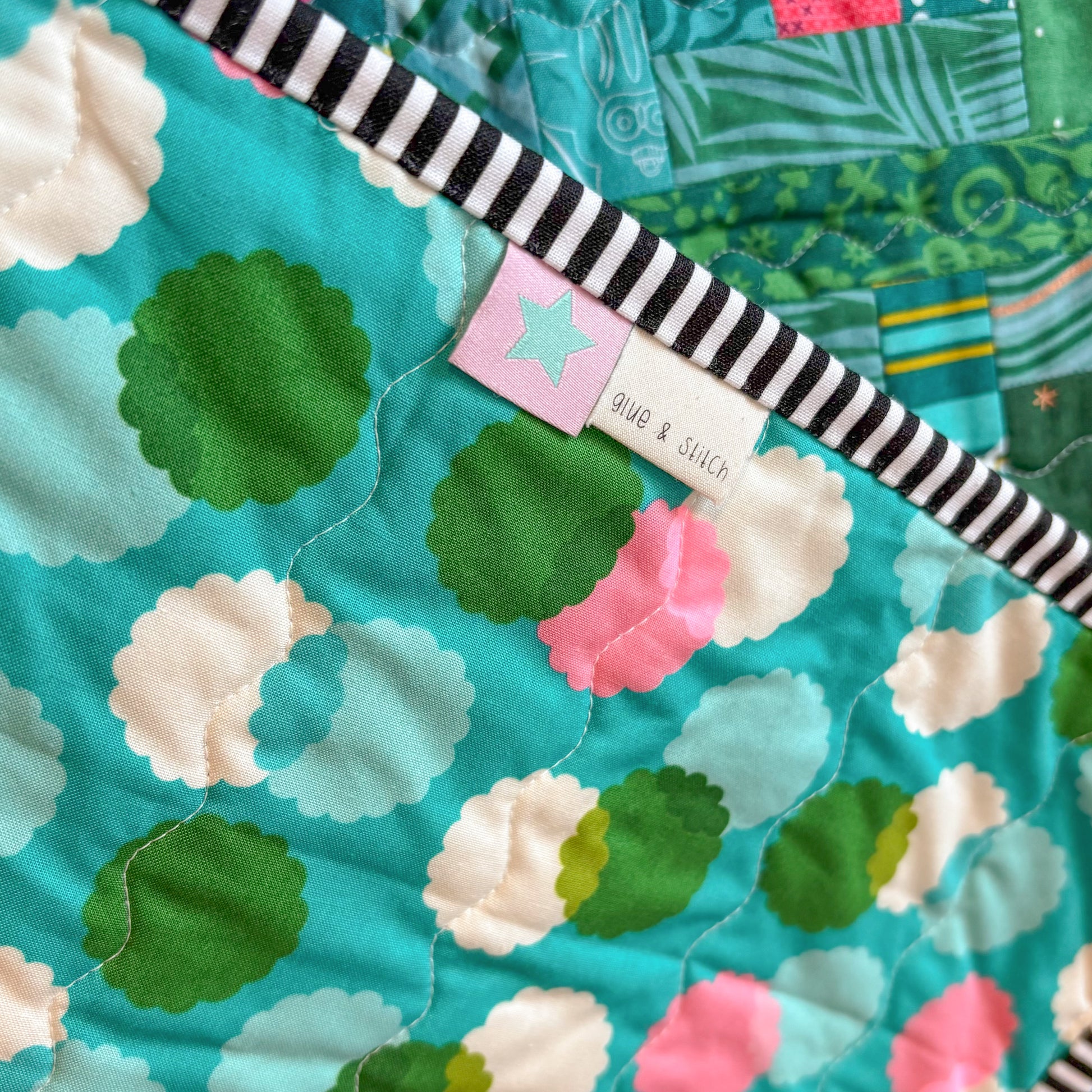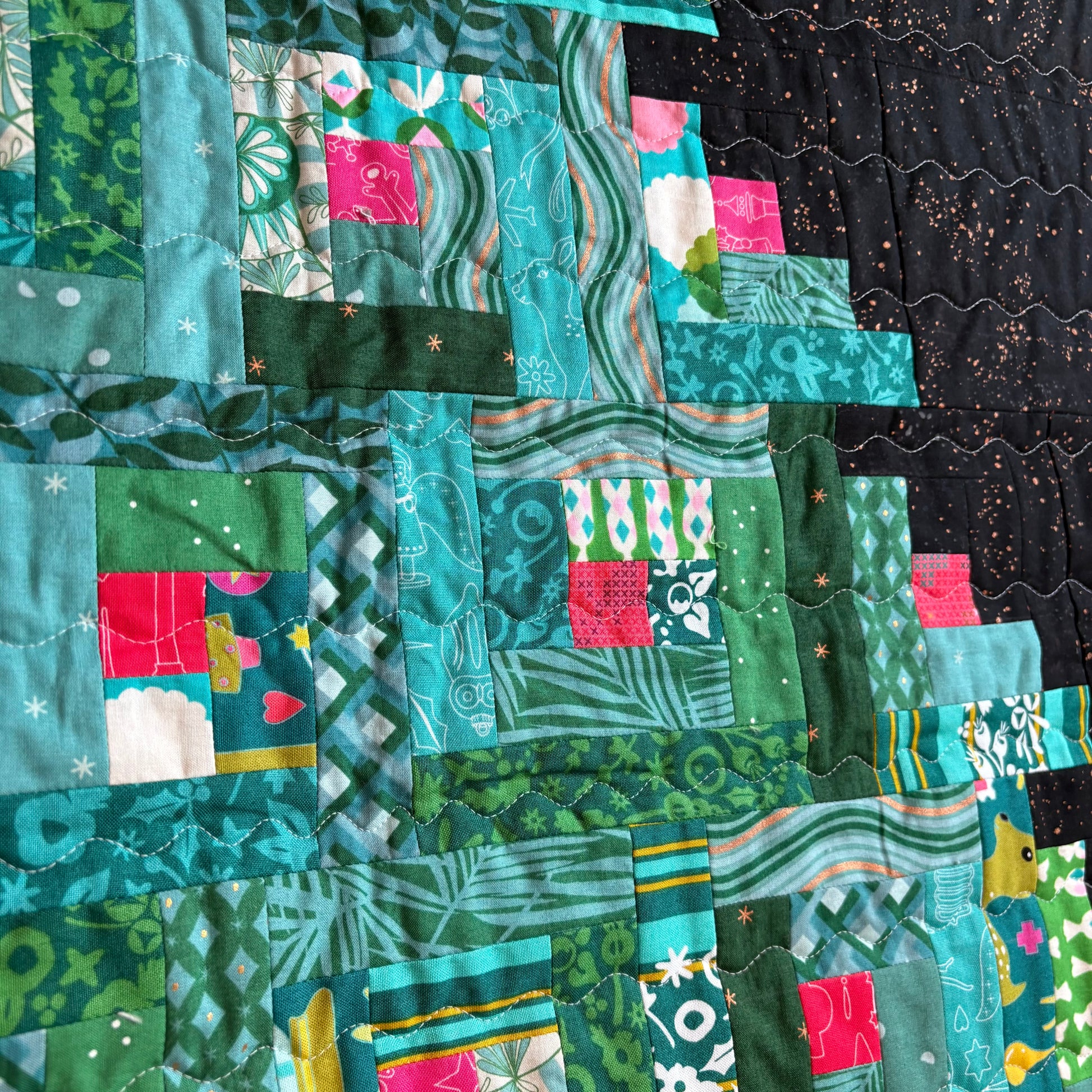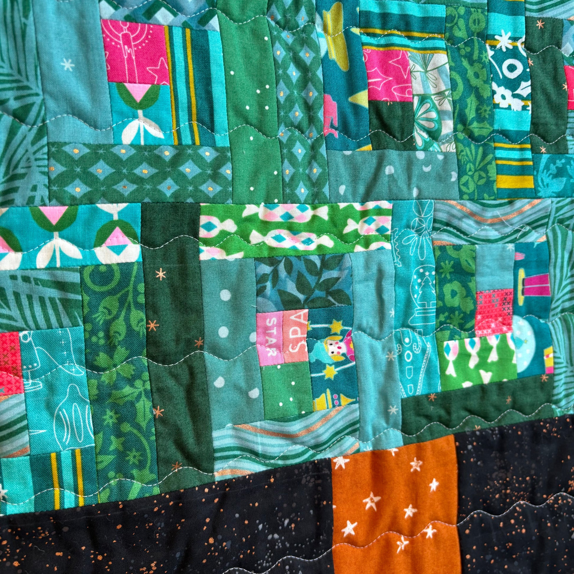 Invite a burst of modern holiday cheer into your home with this Scrappy Mini Christmas Tree Wall Hanging mini quilt, a joyful twist on classic festive décor. A playful log cabin block of vibrant teals, bold fuchsia, and glowing golden yellow pieces stack together to form a tree that shimmers with personality—bright, unexpected, and delightfully fresh. Every little scrap adds its own sparkle, creating a lively mosaic that feels both merry and wonderfully modern. Tiny details of selvage have added into this tree as well. Look closely to find them.