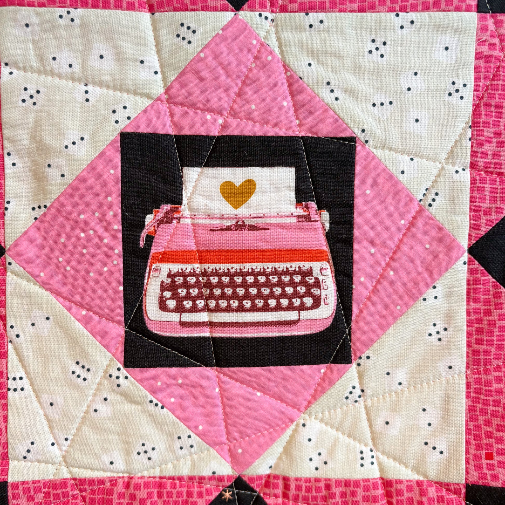 Invite a spark of storytelling charm into your home with Writer’s Block, a delightfully whimsical mini quilt starring the cutest pink typewriter you’ve ever seen. A radiant starburst of rosy pinks, soft neutrals, and inky black prints frames the center motif like an idea glowing to life. Each triangle feels like a tiny spark—thoughts firing, characters whispering, sentences lining up just right.
